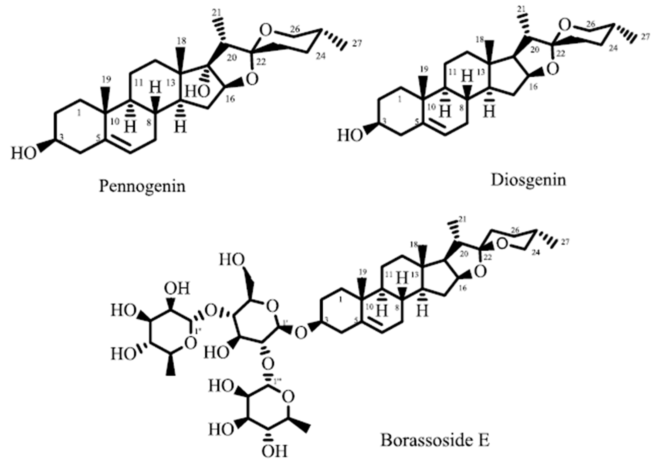 The shade-dried rhizomes of T. govanianum (7 kg) were grounded and extracted with MeOH (40 L) at room temperature, three times for seven days (3 × 40 L). The combined methanolic extract was evaporated to dryness that yielded a brownish gummy residue (512 g). It was further fractionated (solid-liquid partition) into hexane (Hex-fr, 81 g), chloroform (Chl-fr, 94 g), ethyl acetate (EtOAc-fr, 85 g), n-butanol (BuOH-fr, 115 g), and aqueous (Aq-fr, 205 g) fractions. The chloroform and n-butanol fractions were subjected to column chromatography and elution was carried out with mixture of hexane, chloroform, EtOAc and MeOH in increasing order of polarity. The compounds diosgenin and pennogenin were obtained at 20 and 25% EtOAc/hexane solvent system, respectively, while borassoside was obtained at 5% MeOH/EtOAc solvent system. The doses of the extract and its fractions used in the in vivo assays were selected in relation to the usual therapeutic doses of the respective standard drugs (controls) utilized in the pharmacological activities.