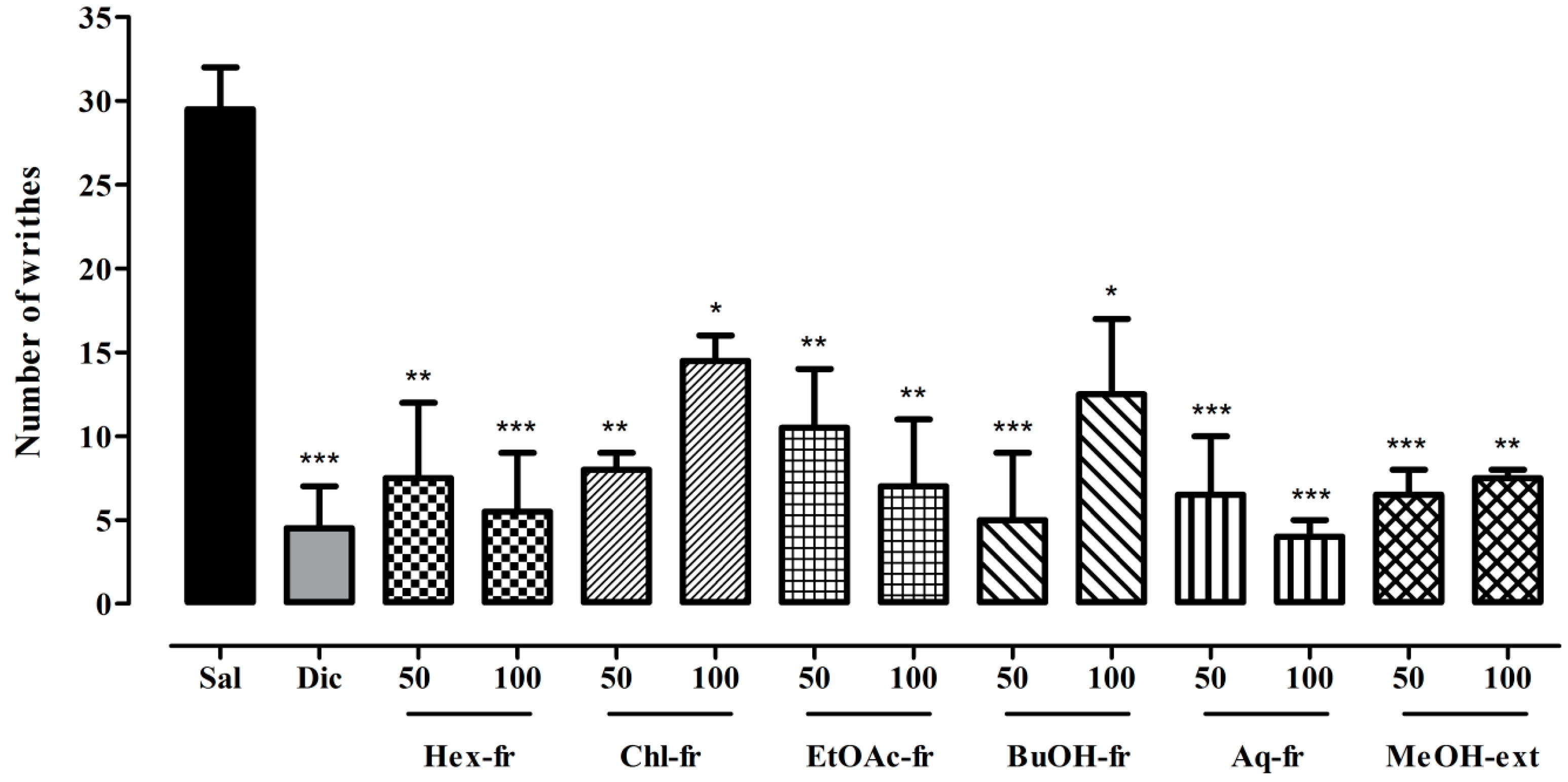 The results of MeOH-ext and its solvent soluble fractions in tonic visceral chemical-induced nociception assay are presented in Figure 2 (Table S1; Supplementary materials), which indicates that 50 and 100 mg/kg doses significantly attenuate acetic acid induced writhes for Hex-fr (p < 0.01, p < 0.001), Chl-fr (p < 0.01, p < 0.05), EtOAc-fr (p < 0.01), BuOH-fr (p < 0.001, p < 0.05), Aq-fr (p < 0.001), and MeOH-ext (p < 0.001, p < 0.01), respectively. The antinociceptive activity was comparable to the standard drug diclofenac sodium, which significantly relieved (p < 0.001) the tonic visceral chemical-induced nociceptive pain.