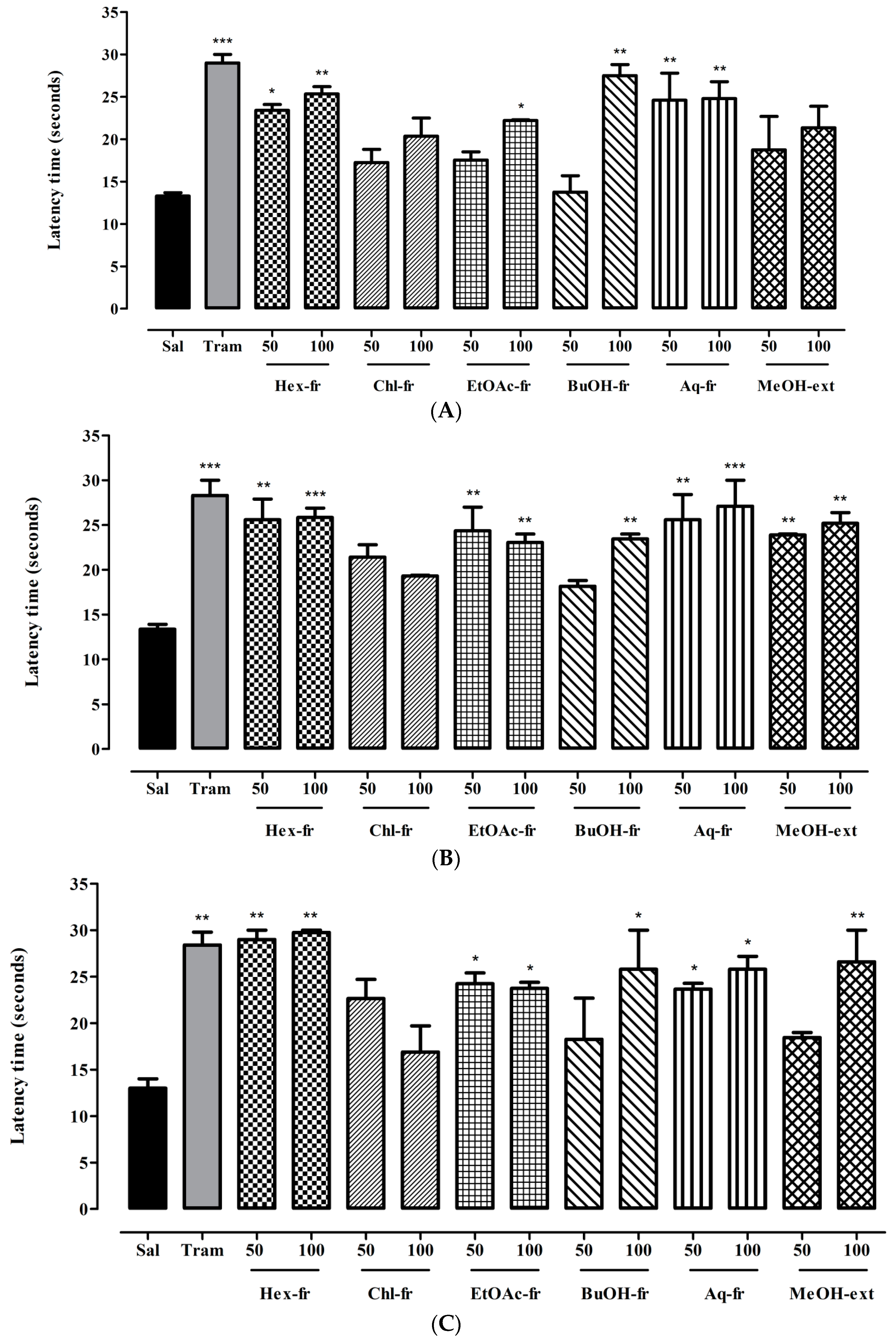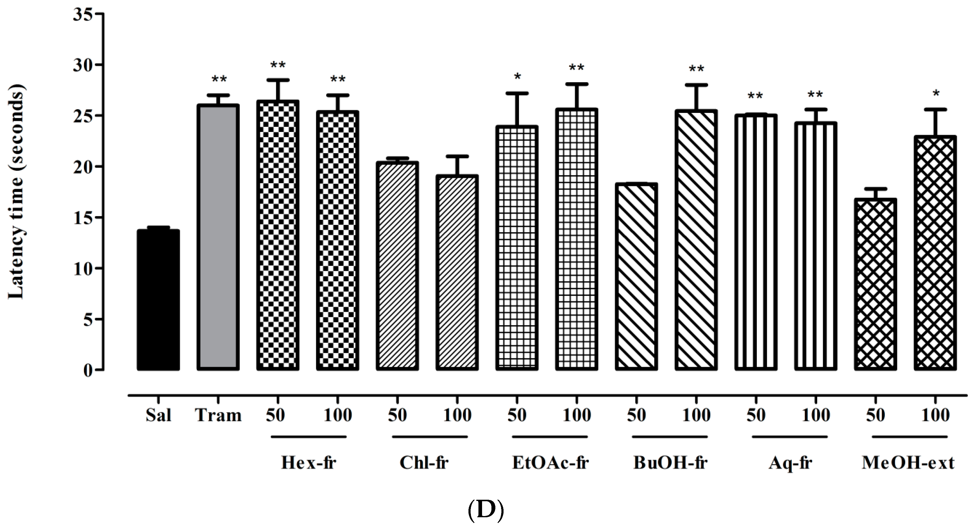 The MeOH-ext and its fractions were evaluated for analgesic effect in the acute phasic thermal nociceptive pain. The results shown in Figure 3A–D (Table S2; Supplementary materials) indicate that, after 30 min, compared to normal saline, significant attenuation of thermal-induced nociception was observed for Hex-fr at 50 mg/kg (p < 0.05) and 100 mg/kg (p < 0.01), EtOAc-fr at 100 mg/kg (p < 0.05), BuOH-fr at 100 mg/kg (p < 0.01), and Aq-fr at 50 and 100 mg/kg (p < 0.01) (Figure 3A). After 60 min, significant analgesic effect was observed for Hex-fr at 50 mg/kg (p < 0.01) and 100 mg/kg (p < 0.001), EtOAc-fr at 50 and 100 mg/kg (p < 0.01), BuOH-fr at 100 mg/kg (p < 0.01), Aq-fr at 50 mg/kg (p < 0.01) and 100 mg/kg (p < 0.001), and MeOH-ext at both doses (p < 0.01) (Figure 3B). Likewise, significant protection against thermal-induced nociception after 90 min was observed with all test doses of Hex-fr (p < 0.01), EtOAc-fr (p < 0.05), Aq-fr (p < 0.05) as well as with 100 mg/kg dose of BuOH-fr (p < 0.05) and MeOH-ext (p < 0.01) (Figure 3C). Moreover, analgesic effect produced after 120 min was significant for all test doses of Hex-fr (p < 0.01), EtOAc-fr (p < 0.05, p < 0.01) and Aq-fr (p < 0.01), and for only 100 mg/kg doses of BuOH-fr (p < 0.01) and MeOH-ext (p < 0.05) (Figure 3D).