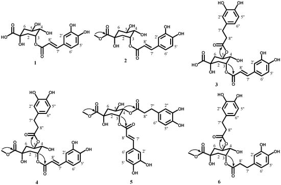 The molecular formula of 5 was determined to be C26H28O12 (MW 532) by negative HRESI-MS data (m/z 531.1507 [M − H]–). The 1H- and 13C NMR spectra of 5 were closely related to those of 4, except for different chemical shifts for the quinic acid moiety (Table 1 and Table 2). In particular, the H-4 at δ 5.02 (1H, dd, J = 7.5, 3.5 Hz) was shifted downfield by 1.5 ppm and the H-5 at δ 4.26 (1H, m) was shifted upfield by 0.99 ppm when compared to the 1H NMR spectrum of 4, suggesting that dihydrocaffeic acid is attached to the C-4 of 3-caffeoylquinic acid methyl ester. The contiguous protonated carbons (C-2–C-6) of the quinic acid moiety were assigned based on their proton–proton correlations detected in the 1H-1H COSY spectrum. In particular, a cross peak (arrow) between δ 5.02 (H-4) and δ 174.2 (C-9″) was observed in the HMBC spectrum (Figure 1), indicating that the dihydrocaffeic acid was esterified with the C-4 of quinic acid. Therefore, compound 5 was determined to be 3-caffeoyl-4-dihydrocaffeoylquinic acid methyl ester, which is also a new compound (Figure 1).