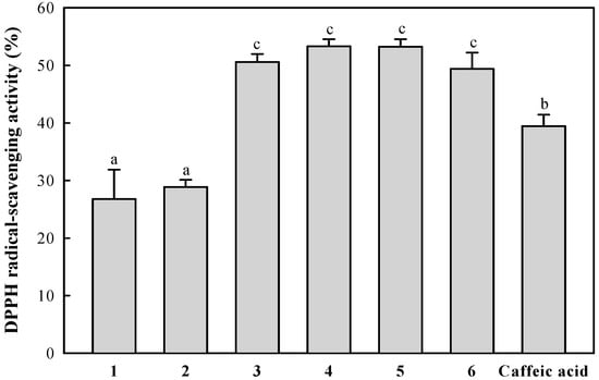 The radical-scavenging activities of the isolated compounds (final concentration, 10 μM) were evaluated using the DPPH radical. As shown in Figure 3, dicaffeoylquinic acid derivatives 3–6, which contain two catechol groups in the partial structure, showed significantly higher DPPH radical-scavenging activity than the monocaffeoylquinic acid derivatives 1 and 2 as well as caffeic acid, which contains a catechol group. The radical-scavenging activities of dicaffeoylquinic acid derivatives 3–6 did not significantly differ (p < 0.05), regardless of structural differences like the presence or absence of the olefinic double bond or the binding position of the caffeic and dihydrocaffeic acids to quinic acid. It was reported previously that the catechol structure in phenolic compounds is an important factor for the radical-scavenging effect. These results indicate that the catechol group may be the main contributor to the radical-scavenging activities of the isolated compounds. This pattern agrees with similar results for the DPPH radical-scavenging activities of dicaffeoylquinic acid derivatives isolated from this plant reported in our previous study [].