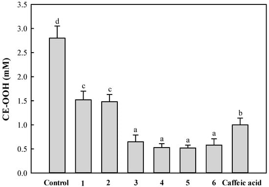 Cholesteryl ester hydroperoxide (CE-OOH) produced by oxidation in healthy human plasma is present at a concentration of ca. 3 nM []. CE-OOH accumulates in atherosclerotic plaques with the progression of lesion development [,]. For this reason, the compound has been used as an index of lipid peroxidation to evaluate the inhibitory effect of antioxidants on lipids oxidized in blood plasma. Therefore, the antioxidant activity of the isolated compounds 1–6 (final concentration, 10 μM) in the copper ion induced-blood plasma oxidation system was examined by measuring the CE-OOH content. As shown in Figure 4, caffeoylquinic acid derivatives 1–6 considerably inhibited CE-OOH formation when compared to the control (no external addition of antioxidant). In particular, the dicaffeoylquinic acid derivatives 3–6 showed a relatively higher ability at inhibiting CE-OOH formation than monocaffeoylquinic acid derivatives 1 and 2 and caffeic acid. This pattern is in good agreement with the results from measuring DPPH radical scavenging.