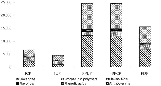The results of the determinations of the contents of polyphenolic compounds (PC) in the analyzed samples are presented in Table 3 and in Figure 1. Their content in juices was significantly affected by the procedure of pulp preparation for pressing. In JCF, the content of polyphenols was higher by over 32% than in JUF. In the case of dried powders, the highest content of PC was obtained in the PPUF (24.45 g/100 g dm) and PPCF (15.61 g/100 g dm), and these values were significantly lower compared to the PDF (24.72 g/100 g dm). The main PC in the analyzed chokeberry products were: anthocyanins > procyanidin polymers >> phenolic acids ≥ flavonols > flavan-3-ols > flavanone. In an earlier study, Oszmiański et al. [5] determined the total phenolic compounds in pomace from black chokeberry at 10.58 g/100 g dm, which was 2.3-times lower compared to the results obtained in this study for pomace and 1.5-times lower compared to whole dried fruits. These differences may be due to various chokeberry cultivation conditions and location and to various methods of material pretreatment for the preparation of products. In a study by Horszwald et al. [1], who analyzed chokeberry powders made by different drying processes, the content of polyphenolics in freeze-dried chokeberry fruits was 27.63 g/100 g dm. This value differed insignificantly compared to the polyphenolic content determined in the powders made of pomace in our study, but was ca. two-times higher compared to PDF.