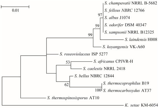 - Williams, S.T.; Goodfellow, M.; Alderson, G.; Wellington, E.M.; Sneath, P.H.; Sackin, M.J. Numerical classification of Streptomyces and related genera. J. Gen. Microbiol. 1983, 129, 1743–1813. [Google Scholar] [CrossRef] [PubMed]