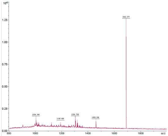 The purified insecticidal peptide (fraction No. 2D1-2D2) was analyzed by molecular mass determination and amino acid sequence analysis. The TOF-MS analysis showed that the molecular was 1691.377 Da (Figure 4). The analysis of amino acid sequence revealed that it was a 15 amino acid peptide (named SLP1). The amino acid sequence of SLP1 was determined to be S-E-P-A-Q-I-V-I-V-D-G-V-D-Y-W (Ser-Glu-Pro-Ala-Gln-Ile-Val-Ile-Val-Asp-Gly-Val-Asp-Tyr-Trp) as shown in Figure S1. As far as we know, the insecticidal peptide SLP1 is a novel peptide with the insecticidal activity against L. erysimi.