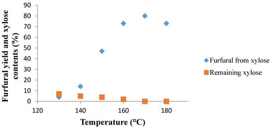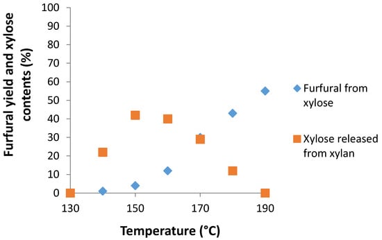 The production of furfural from xylan involves a two-step reaction: a pseudo-first order irreversible depolymerization and a pseudo-first order dehydration. In our conditions optimized for the dehydration of d-xylose (Nafion NR50 (2 pellets), NaCl (95 mg), water (1 mL), CPME (3 mL), MW, 170 °C and 40 min), the xylan oligomer furnished the target furfural in a 19% yield. Thus, an increase of the time period (60 min vs. 40 min) and the variation of the temperature (130, 140, 150, 160, 170, 180 and 190 °C) were realized (Figure 7). As temperature rose from 130 °C to 160 °C, hydrolysis of xylan into d-xylose was accelerated, and the amount of sugar released in the media increased to reach a maximum of 42%. Then, from 140 °C, d-xylose was dehydrated into furfural, in a range of temperatures from this temperature to 170 °C, but the furfural concentration remained under the concentration of the released xylose. The yield increased from 30% to 55% with an increasing temperature from 170 °C to 190 °C. In regards to our results, the optimized conditions of furfural formation from xylan were identified: Nafion NR50 (2 pellets), NaCl (95 mg), water (1 mL), CPME (3 mL), MW, 190 °C and 60 min.