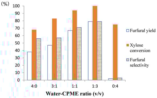 Effect of the water-CPME volumetric ratio on dehydration of d-xylose to furfural. Reaction conditions: Nafion NR50 (2 pellets), NaCl (95 mg), d-xylose (1.0 mmol), water-CPME, MW, 170 °C and 40 min.