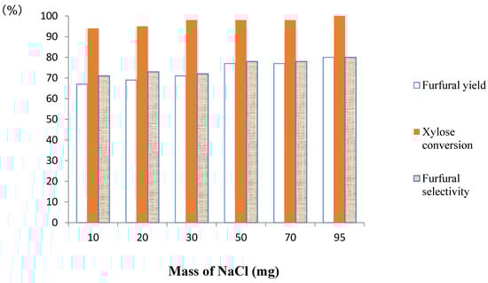 To the best of our knowledge, the inner structure of the Nafion NR50 pellets remains unclear, but all sulfonic acid functions were supposed to be accessible. In our process, when NaCl was added to the aqueous phase, a cation exchange between the Na+ of the salt and the H+ of the sulfonic acid groups of Nafion occurred, and HCl was released in the aqueous phase. Besides, the salt formed a coating on the pellets and seemed to protect them from the deposition of humins and, thus, from explosion. The impact of the ratio of Nafion NR50-NaCl on the dehydration of d-xylose process was investigated using the optimized method described above: Nafion NR50 (two pellets), NaCl, d-xylose (1.0 mmol), water (1 mL), CPME (3 mL), MW, 170 °C and 40 min. As reported in Figure 4, the mass of NaCl was progressively increased until a maximum of selectivity was obtained with 95 mg of NaCl. However, with only 50 mg of NaCl, the reactions started to furnish better selectivities (78%). This result corroborates a recent study that demonstrates the impact of increasing the concentration of NaCl on the produced furfural yield [30]. The same protocol was realized using only one pellet of Nafion NR50 (45 mg), but furfural was obtained in a lower yield (72%) (Figure S2, ESI).