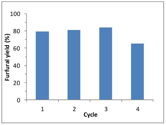 Several consecutive reactions were performed with the same Nafion NR50 pellets. After each reaction, the resin pellets were recovered from the reaction medium and regenerated in an acidic HCl bath overnight. The reactions were performed for 40 min at 170 °C in water-CPME, 1:3, v/v. The activity of the Nafion NR50 pellets was kept constant for three consecutive cycles (Figure 5). After the fourth cycle, the furfural yield began to decrease. This observation can be explained by the gradual deactivation of the pellets by humin deposition.