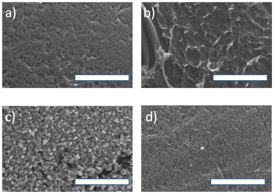 FE-SEM images of the Nafion NR50 surface morphology obtained from: (a) pristine Nafion; (b) the reaction without salt; (c) with salt after one catalytic run; (d) after regeneration in concentrated HCl solution (scale bar = 50 µm).