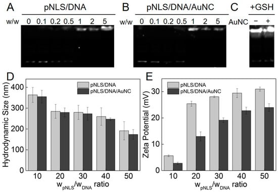 DNA compaction capability. Agarose gel electrophoresis retardation assay of (A) pNLS/DNA complexes and (B) pNLS/DNA/AuNC complexes in 10 mM phosphate buffered saline (PBS); and (C) complexes without or with AuNC at pNLS/DNA weight ratio of 10 in 10 mM GSH. Hydrodynamic size (D) and zeta potential (E) of pNLS/DNA complexes and pNLS/DNA/AuNC complexes at different weight ratios.