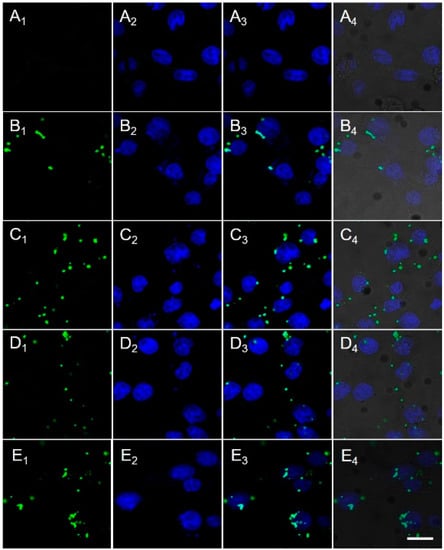 In order to observe the intracellular fate of the delivered gene, DNA was labelled with YOYO-1, and the pNLS/DNA complexes at w/w ratio of 50:1 and the pNLS/DNA/AuNC complexes at w/w/w ratio of 50:1:5 were, respectively, prepared. PLL/DNA complexes at the w/w ratio of 50:1 were used as control. DNA labelled with YOYO-1 was displayed in Figure 3A1–E1, while the nucleus stained by Hoechst 33258 was shown in Figure 3A2–E2, and the merged fluorescent images were presented in Figure 3A3–E3, and the merged bright and fluorescent images were visible in Figure 3A4–E4. According to the confocal images in Figure 3, the cells treated with naked DNA displayed negligible green fluorescence, and the cells treated with different complexes showed obvious intracellular green fluorescence. Electronegative naked DNA was difficult to get into cells, but all complexes were able to transfer DNA into cells. The intracellular green fluorescence of pNLS/DNA complexes (Figure 3C) was stronger with that of PLL/DNA and pNLS/DNA/AuNC complexes (Figure 3B,D), attributing to their high zeta potential and strong electrostatic interaction with cell membrane. Meanwhile, the cellular uptake rate of the complexes was quantitatively analyzed by flow cytometry. Cells treated with naked DNA showed less than 7% of YOYO-1-positive cells and fairly low intracellular mean fluorescence intensity, but cells treated with all three complexes exhibited over 38% YOYO-1-positive cells (Figure S2, Supplementary Materials). In addition, the mean fluorescence intensity of YOYO-1 in cells of all three complexes measured by flow cytometry displayed similar tendency to what observed by CLSM. As demonstrated above, the pNLS/DNA complexes, pNLS/DNA/AuNC complexes and PLL/DNA complexes all hold great capability in cell entry via electrostatic interaction with cell membrane. However, after 4 h co-incubation, the green fluorescence of DNA in all complex-treated cells were mainly distributed in the cytoplasm and yet displayed no overlap with the blue fluorescence of the nuclei. These findings indicated that at current stage, the DNA loaded in all three complexes were entrapped in endo/lysosomal entrapment and result in limited nuclear translocation. However, when treated with NIR irradiation, cyan fluorescence (the overlapping of blue and green florescent signals) emerged in the nuclear region of the pNLS/DNA/AuNC complex-treated cells (Figure 3E), indicating the nuclei accumulation of the DNA. This finding manifested that, under NIR illumination, the pNLS/DNA/AuNC complexes can effectively mediate endo/lysosomal escape and nuclei import of DNA.
