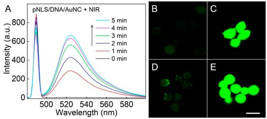 (A) ROS detection by DCFH in solution containing pNLS/DNA/AuNC complexes under NIR irradiation for different period. ROS detection by DCFH-DA in cells treated with (B) AuNC; (C) AuNC + NIR irradiation; (D) pNLS/DNA/AuNC complexes; and (E) pNLS/DNA/AuNC complexes + NIR irradiation. Scale bar: 20 μm. (Green channel: excitation at 488 nm, emission at 500–550 nm).