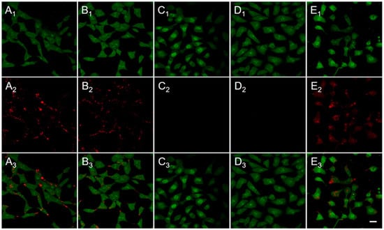 AO staining of cells treated with (A) AuNC; (B) pNLS/DNA/AuNC complexes; (C) AuNC + NIR irradiation; (D) pNLS/DNA/AuNC complexes + NIR irradiation and (E) pNLS/DNA/AuNC complexes + NIR irradiation + Vitamin C. The green fluorescent field for cytoplasm and nuclei (A1, B1, C1, D1 and E1), red fluorescent field for acidic organelles (A2, B2, C2, D2 and E2), and merged field of green and red fluorescent fields (A3, B3, C3, D3 and E3). Scale bar: 20 μm. (Excitation at 488 nm; green channel: emission at 500–550 nm; red channel emission at 630–670 nm).