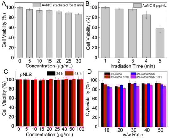 Cytotoxicity of AuNC under NIR irradiation (A) with different concentration and (B) for different exposure time; (C) cytotoxicity of cationic polypeptide pNLS; and (D) photo/dark toxicity of pNLS/DNA binary complexes and pNLS/DNA/AuNC complexes. Data are shown as mean ± S.D. (n = 6).