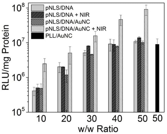 High-performance gene transfection is the foremost feature of the gene delivery carriers. To assess the transfection efficiency of different complexes, luciferase plasmid DNA pGL-3 was applied as model reporter genes. As shown in Figure 7, without NIR irradiation, the transfection level of pNLS/DNA complexes and pNLS/DNA/AuNC complexes were similar at all w/w ratios tested, owing to their related capability in cell entry and endo/lysosomal escape. Without irradiation, the complexes may be trapped in the acid organelles, and ended in exocytosis pathway, then the gene transfection process was inhibited. However, after exposed to NIR irradiation, the transfection efficiency of pNLS/DNA/AuNC complexes were enhanced sharply, while pNLS/DNA demonstrated negligible changes. These findings indicated that, the decoration of AuNC to the surface of the pNLS/DNA complexes could result in enhanced gene delivery efficiency. Thus, by decorating the ROS generator AuNC to the surface of the pNLS/DNA complexes, the obtained pNLS/DNA/AuNC complexes could generate ROS to disrupt the acidic endo/lysosomes under NIR irradiation, mediate enhanced endo/lysosomal escape, then respond to the reducible cytoplasm, direct nuclear translocation for efficient gene transfection.