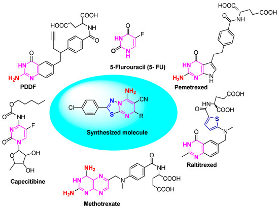 Folate metabolism is considered as an important target for the development of new anticancer agents due to its role in the biosynthesis of nucleic acid precursors [5,6]. The inhibition of folate dependent enzymes such as thymidylate synthase (TS), which catalyzes the reductive methylation of deoxyuridylate (dUMP) to thymidylate (dTMP) has also been recognized as an interesting target for drug discovery [7,8]. Inhibition of this enzyme leads to thymineless state, rendering cells incapable of undergoing accurate DNA replication, ultimately resulting in cell death. Classical, antifolate inhibitors of thymidylate synthase often suffer from a number of potential disadvantages when used as anticancer agents. These include impaired uptake due to an alteration of the active transport system required for cellular uptake, as well as the formation of long acting, non-effluxing polyglutamates via folypolyglutamate synthetase, which are responsible for toxicity to normal cells. Nonclassical antifolates such as nolatrexed (AG337), AG331, pyrimethamine, trimethoprim (TMP), piritrexim (PTX) and trimetrexate (TMQ) do not require folate transport systems but enter cells via passive diffusion. Recent advances in non-classical antifolates have been documented in the literature [9,10,11]. To overcome some of the disadvantages of classical thymidylate synthase inhibitors, our team has tried to synthesize novel 5-amino-2-(4-chlorophenyl)-7-substituted phenyl-8,8a-dihydro-7H-(1,3,4)thiadiazolo(3,2-α)pyrimidine-6-carbonitrile derivatives.