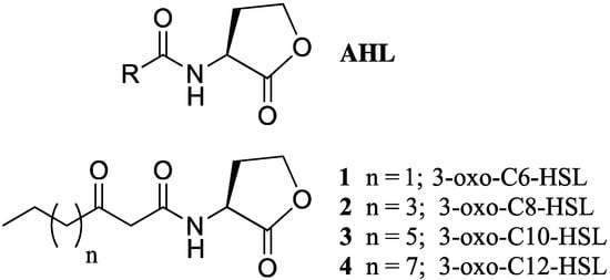 - Geske, G.D.; O’Neill, J.C.; Miller, D.M.; Wezeman, R.J.; Mattmann, M.E.; Lin, Q.; Blackwell, H.E. Comparative analyses of N-acylated homoserine lactones reveal unique structural features that dictate their ability to activate or inhibit quorum sensing. ChemBioChem 2008, 9, 389–400. [Google Scholar] [CrossRef] [PubMed]