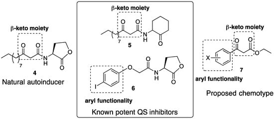 Synthetic mimics of natural substrates have proven to be promising starting points for designing inhibitors of bacterial QS. Non-natural derivatives of the N-acylated homoserine lactone (AHL)—the most common autoinducers used by gram negative bacteria []—have shown promise for disrupting QS [,]. In contemplating new scaffolds that could inhibit QS pathways, we were intrigued by the β-keto moiety (3-oxo) present in many native AHLs (Figure 1), including the 3-oxo-C6-homoserine lactone (HSL) (1) of Vibrio fischeri [] and the pathogen Erwinia carotovora [], the 3-oxo-C8-HSL (2) of Agrobacterium tumefaciens [], the 3-oxo-C10-HSL (3) of enteric pathogen V. fluvialis [], and the 3-oxo-C12-HSL (4) of Pseudomonas aeruginosa []. However, hydrolysis of the lactone present in the AHLs by mammalian lactonases [] limits their potential as anti-virulence drugs. Several groups have identified non-natural modulators of AHL-based quorum sensing in which the native homoserine lactone moiety has been replaced with an aromatic group or with cyclic carbocycles (5, Figure 2) [,,]. It has also been shown that the central amide connective function of AHLs can be replaced with various non-native moieties, and these non-natural derivatives still retain activity as synthetic modulators of LuxR-based quorum sensing [,,]. In addition, previous results from the literature demonstrate that the incorporation of aryl functionality with electron-withdrawing groups onto the acyl side chain renders many small-molecule AHL mimics potent quorum sensing inhibitors (6, Figure 2) [,,]. Thus, we hypothesize that the simplest structural motif that could possess anti-QS activity might be β-keto esters containing aryl functionality (7, Figure 2).
