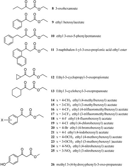 The initial β-keto esters tested included ethyl 3-oxohexanoate (8), ethyl benzoylacetate (9), ethyl 3-oxo-phenylpentanoate (10), and 3-naphthalen-1-yl-3-oxo-propionic acid ethyl ester (11). Only the ethyl benzoylacetate demonstrated QS inhibition with a zone of luminescence inhibition 27 mm in diameter and with no visible inhibition of growth.