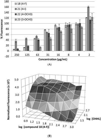The panel of β-keto ester analogs demonstrated strong QS antagonist activity against the wild-type reporter strain V. harveyi BB120. Though the exact mechanism is not clear with this assay, the structural similarities to AHL autoinducers suggests that the β-keto ester could modulate LuxR-based QS through the AHL-dependent pathway. The mutant Escherichia coli JB525, containing the luxR-PluxI from V. fischeri fused to gfp, was used to evaluate the mechanism of QS inhibition []. The biosensor produces unstable green fluorescent protein (GFP) in response to the activation of LuxR by exogenous AHL. Binding of an inhibitor to LuxR in the presence of exogenous AHL will lead to reduced GFP, suggesting that the inhibitor and AHL compete for the same receptor []. A dose–response competition assay was performed on the β-keto ester analogs with IC50 values less than 50 µM, while holding the concentration of the native V. fischeri AHL—3-oxo-hexanoyl-HSL (1, OHHL)—at 32 nM. All four showed concentration-dependent inhibition of GFP, suggesting antagonistic activity of AHL-mediated QS (IC50 values: 4-flouro (18) = 48 µg/mL, 4-iodo (21) = 88 µg/mL, 4-methoxy (22) = 45 µg/mL, and 3-methoxy (23) = 24 µg/mL; Figure 4a). The bacterial natural product 3-methyl-N-(2′-phenylethyl)-butyramide was used as a control, and an IC50 of 29 µg/mL was obtained, compared to the reported IC50 of 19 µg/mL []. No growth inhibition of E. coli JB525 was observed at the concentrations tested.