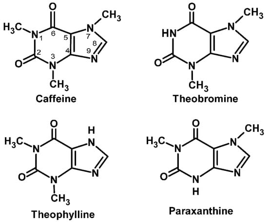 Methylated xanthines (or methylxanthines) are produced in considerable amounts in a limited number of botanical species, including tea (Camellia sinensis L.), coffee (Coffea sp.) and cacao (Theobroma cacao L.), as we will further develop in Section 3 of this review. The most relevant methylxanthines are caffeine, theobromine and theophylline. It has been proposed that plants started biosynthesizing methylxanthines as protection against pathogens and predators, namely insects [4,5].