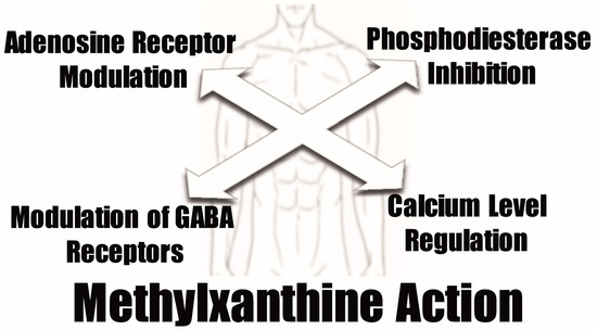 Despite the positive effects that the antioxidant properties of methylxanthines may originate, their pharmacological activities are normally related to other physiologic activities. Normally, four different mechanisms are proposed to mediate the pharmacological methylxanthine activity at the cellular level: antagonism of adenosine receptors, phosphodiesterase inhibition, modulation of GABA receptor action, and regulation of intracellular calcium levels [127,128,129,130,131,132] (Figure 3).
