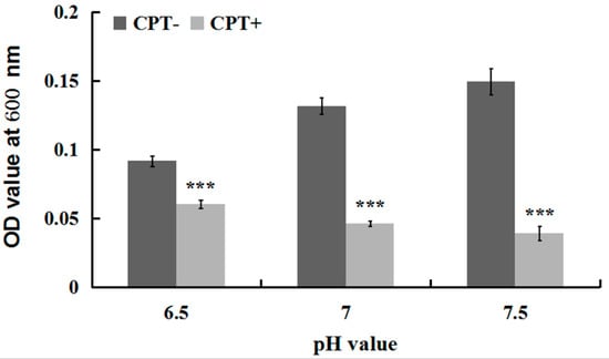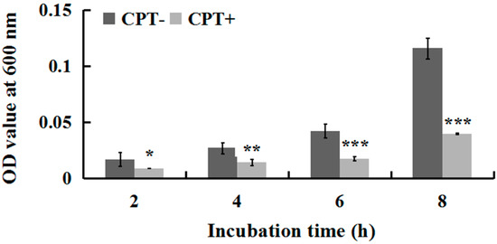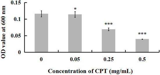 APA StyleDong, Q., Luo, J., Qiu, W., Cai, L., Anjum, S. I., Li, B., Hou, M., Xie, G., & Sun, G. (2016). Inhibitory Effect of Camptothecin against Rice Bacterial Brown Stripe Pathogen Acidovorax avenae subsp. avenae RS-2. Molecules, 21(8), 978. https://doi.org/10.3390/molecules21080978