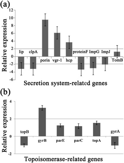 - Weber, B.; Hasic, M.; Chen, C.; Wai, S.N.; Milton, D.L. Type VI secretion modulates quorum sensing and stress response in Vibrio anguillarum. Environ. Microbiol. 2009, 11, 3018–3028. [Google Scholar] [CrossRef] [PubMed]