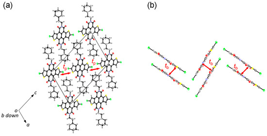 One of the reasons for introducing the 2-cyclohexyl group as the relatively bulky alkyl group rather than the n-octyl group is that we would like to know its effect on the packing structure. Figure 4 shows the packing structure of 3 elucidated by single-crystal X-ray analysis. Different from our initial expectations, the packing structure of 3 is classified into the π-stacking columnar structure (π-π distance: 3.47 Å), and is very similar to that of 1. Although the space group and the direction of the unit cell of 3 are different from those of 1, the mutual positions of the π-stacking columns are basically the same (Figure 4a); the molecular π-plane in the neighboring columns in the [1 0 1] direction tilts in the opposite direction, resulting in the perpendicular molecular arrangement in the adjacent columns (Figure 4b). This may indicate that even with the 2-cyclohexylethyl group, which is bulkier than the n-octyl group, the balance between the sizes of the NDTI core and the substituents is not suitable for realizing the 2D π-stacking (Figure 2a). The calculated transfer integrals of LUMOs (orbital overlaps) between the molecules in the stacking columns (tb) are 90 meV, whereas those between the columns (tp) are 17 meV [29]. These values are comparable to those calculated for 1 (75 and 16 meV, respectively), indicating that 3 has a similar 1D electronic structure in the solid state to 1.
