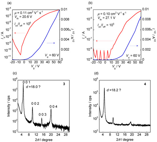 Transfer characteristics of 3- (a) and 4- (b) based n-type thin-film transistors (TFTs) evaluated under ambient conditions, and out-of-plane X-ray diffraction (XRD) patterns of vapor-deposited thin films of 3 (c) and 4 (d) on the Si/SiO2 substrate at 150 °C.