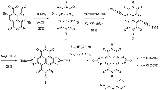 Synthesis of N,N′-bis(2-cyclohexylethyl)-NDTI derivatives (3 and 4).