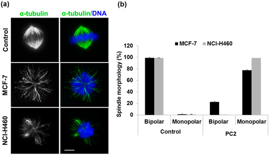 Treatment with PC2 induces mitotic spindle collapse in MCF-7 and NCI-H460 cells. (a) Immunofluorescence staining with anti-α-tubulin antibody. Control cells exhibited normal microtubule fibers (green) assembled into a well-organized bipolar mitotic spindle, while treated cells have monopolar spindles. DNA was counterstained with DAPI (blue); (b) Graph showing percentage of bipolar and monopolar spindles in control and compound-treated cells; (c) Double immunostaining with anti-γ-tubulin (red) and anti-α-tubulin (green) antibodies, showing typical face-to-face poles of a bipolar spindle in control and side-by-side poles of a collapsed spindle in compound-treated cells. Scale bar = 5 μm.