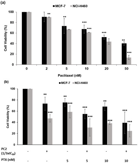 The chalcone PC2 enhances cytotoxicity of cancer cells to paclitaxel (PTX). (a) Relative cell viability of MCF-7 and NCI-H460 cells treated with increased concentrations of PTX (0–50 nM) for 48 h; (b) Relative cell viability of MCF-7 and NCI-H460 cells treated with PC2 (1/3 × IC50) in combination with PTX (5 or 10 nM) for 48 h; (c) Colony forming efficiency of MCF-7 and NCI-H460 cells: cells were exposed for 48 h to PC2, PTX, or the combination of both, washed, and allowed to grow in fresh medium for 10 days before crystal violet staining. Representative figures are shown and viable colonies, of at least 50 cells each, (top) were counted and the results expressed as % survival fraction relative to control (bottom). Results are expressed as mean ± standard deviation (SD), from at least three independent experiments. (***) represents p < 0.001; (**) represents p < 0.01, PC2 and/or PTX versus control.