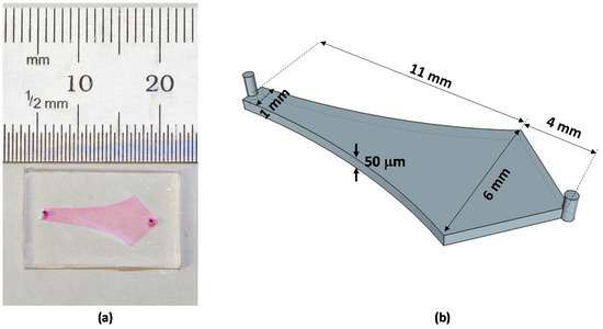 The microfluidic channel used in this study. (a) A photograph of the microfluidic channel; and (b) a schematic showing the geometry of the microchannel.