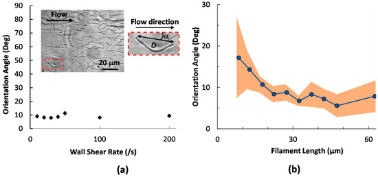 We further inspected whether the orientation was influenced by the length of the filamentous cells, with wall shear rates between 10 and 200 s−1. The dots in Figure 2b are orientation angles averaged for filaments binned at <10 μm, >50 μm and in the range of 10–50 μm with 5-μm intervals. The shaded area represents 95% confidence interval of the average. As observed in Figure 2b, filamentous cells shorter than 15 μm in length align more randomly from the flow direction, thus having greater orientation angle averages and wider confidence intervals. As the length increases, the cells align more consistently with the flow, bringing the orientation angle to around 10°.
