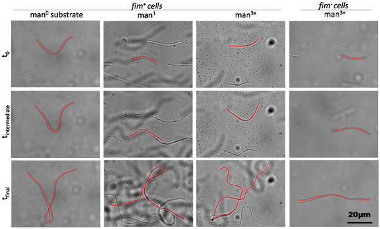 Time-course imaging of filamentous cells in microfluidic channels with varied mannosylation. Representative images show filamenting cells in the same field of view at the initial time point (t0), an intermediate time point (tintermediate, ~20 min) and after elongation ceased (tfinal). Cells were either fimbriated (fim+) or non-fimbriated (fim−) and attached to substrates with no mannosylation (man0), monomeric mannose (man1), or oligomeric mannose (man3+). Red lines trace single cells tracked over time and remaining in the field of view throughout the time course.