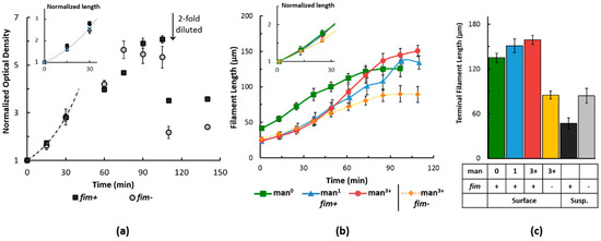 Additionally, filamenting cultures were monitored for growth rate in suspension (Figure 4a) and on surfaces (Figure 4b) and for terminal length after growth ceased (Figure 4c). Of note, termination of growth in suspension was confirmed by diluting cultures in half with fresh nutrient medium upon reaching a stationary phase and observing no subsequent increase in culture density (Figure 4a). The doubling times obtained for all the growth conditions are compiled in Table S1 in the Supplementary Materials. The exponential growth rates of fim− and fim+ cells under filamenting conditions were identical during suspended culturing, with an estimated exponential doubling time of ~20 min, observed by a normalized growth curve, plotted as a ratio of the optical density to the initial condition at 0 min (Figure 4a). Since optical density is not fully reliable when cell shape changes, the doubling time was also checked by length measurements with optical microscopy (Figure 4a, inset) and found to be identical.