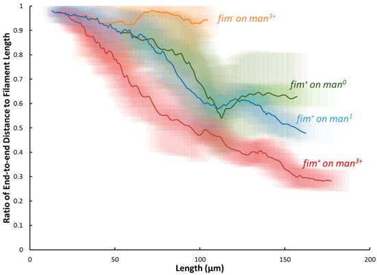 To quantify the extent of buckling, the distance between the ends of the filaments was divided by the total length of the filament. If the filament is fully extended, the end-to-end distance is equal to the total length of the filament and the ratio is equal to 1. As the filament buckles and becomes more coiled the ratio decreases. In Figure 5, the ratio of the end-to-end distance to total length is plotted as a function of filament total length. The lines show moving averages for fim+ filaments on the three surfaces examined and for fim− filaments on the man3+ surface. The shaded region around each line shows the region encompassed by one standard deviation away from the average. For all the conditions examined, at short lengths the ratio is close to unity. In part, this is because the filaments tend to be fully extended in solution before they are put on the surface. (Typical ratios in solution are 0.9–0.95). Additionally, for short filaments, a smaller length needs to slip along the surface to avoid buckling, making it easier for the filaments to grow extended. As the filaments grow, there tends to be a length beyond which the filaments buckle rather than continue to extend. This length depends on the strain examined and on the degree of surface mannosylation. The fim− filaments on man3+ remain nearly straight for all lengths, with an average ratio of 0.95. In contrast, fim+ bacteria on the man3+ surface begin buckling as soon as they adhere to the surface, with no minimum length for the onset of buckling. Although this onset was delayed until longer filamentation for fim+ bacteria on man0 and man1 substrates, their filamentation also showed a steady trend in buckling with length-dependent ratios comparatively similar to each other. Overall, between the fim+ cells on any substrate and fim−, the end-to-end ratios became distinguishable (at p < 0.01) by the 75 μm elongation point. Further, the ratios of all fim+ cells continued to decline with elongation, diverging in a substrate-dependent manner (at p < 0.01) for filaments greater than 145 µm; resultantly, the end-to-end spread of the longest comparable filaments (at ~ 157 µm) was statistically different (at p < 0.01) across the various substrates at a ratio of 0.63 on man0, 0.50 on man1, and 0.30 on man3+. From these trends, the presence of fimbriae-mediated adhesion leads to a buckling phenomenon during filamentation on surfaces, where the length ratio is a metric of buckling. Buckling during filamentation was initiated most readily on the man3+ substrate and, above a threshold length of 145 µm, resulted in an inverse relationship between the length ratio and mannose content.