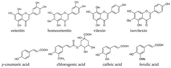 Regarding the phenolics, caffeic acid had the strongest total antioxidant capacity (1374.03 ± 11.50 U/µmol DW), followed by chlorogenic acid (703.56 ± 2.79 U/µmol DW), ferulic acid 684.54 ± 5.15 U/µmol DW, Trolox (684.33 ± 11.71 U/µmol DW) and p-coumaric acid 21.69 ± 7.49 U/µmol DW; In comparison, orientin exhibited the strongest total antioxidant capacity (76.83 ± 0.82 U/µmol DW), followed by homoorientin (75.38 ± 1.12 U/µmol DW), vitexin (11.29 ± 1.57 U/µmol DW) and isovitexin (10.52 ± 0.76 U/µmol DW).
