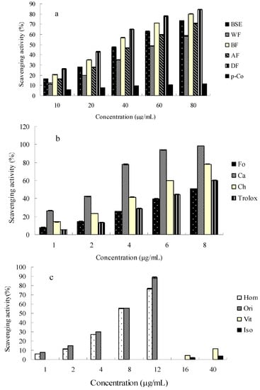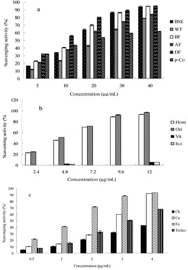 ABTS●+ is a synthetic radical that can be used to assess the scavenging activity of both polar and non-polar antioxidant chemicals [14]. Therefore, this assay was suitable to further assess the BSE fractions and their characteristic compounds against the synthetic ABTS●+ free radical. Figure 2 shows the percentages of scavenging ABTS●+ radicals by all the fractions and individual bioactive compounds at different concentrations, which exhibit good correlations with their concentrations.