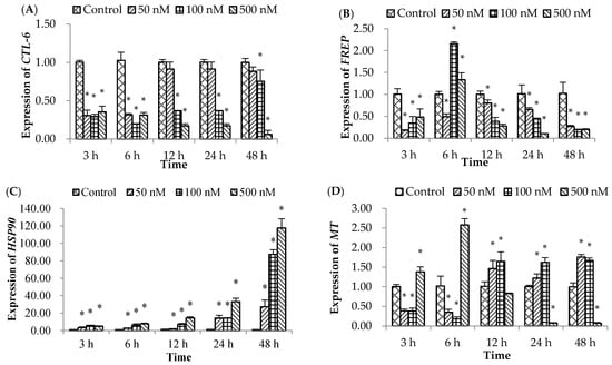 CTL-6 gene expression (Figure 2A) in the three OA treatment groups was lower (p < 0.05) than that in the control group at 3–48 hpe, except in the 50 nM OA treatment group at 12–48 hpe, which returned to normal levels compared to the control.