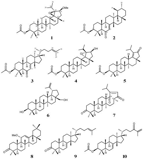 Taraxacum officinale (commonly known as dandelion) has a number of culinary and medicinal uses, despite being generally regarded as a weed. Dandelion is the general name of approximately two thousand species of plants that belong to the genus Taraxacum (Compositae). Young leaves and inflorescences are used as ingredients in salads and stir-fries. Dandelion roots have long been largely used on the continent, and the plant is cultivated largely in India as a remedy for liver complaints. Dandelion roots contain bitter principles that have a tonic effect on the liver and digestive system [1]. It is also a gentle laxative and natural diuretic that is rich in natural potassium, which enriches the body′s supply. It has been used as a tonic to treat rheumatic issues and also acts as a blood purifier [2]. In recent studies, it was revealed that dandelion extract may play a significant role during adipogenesis and lipid metabolism, and may have the potential for the treatment of obesity [3]. Dandelion is available as capsules, liquid extracts, and tea forms [4]. We previously reported five novel lupan-type triterpenoids isolated from the roots of T. officinale. Of these, officinatrione, a (17S)-17,18-seco-lupane was identified as a new carbon skeletal triterpenoid [5]. We herein reported three new triterpenoids: 18β,19β-epoxy-21β-methoxylupan-3β-yl acetate (1), 3β-acetoxybauer-7-en-6-one (2), 3β-acetoxyeupha-7,24-dien-6-one (3), in addition to seven known compounds (4–10) (Figure 1). The isolated compounds (1–10) were evaluated for their inhibitory activities on macrophage activation using an inhibitory assay of nitric oxide (NO) production in RAW 264.7 mouse macrophages stimulated by lipopolysaccharide (LPS).
