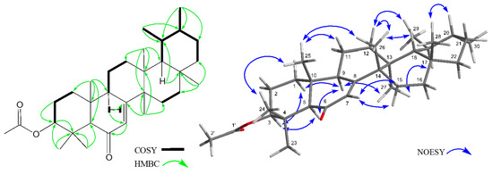 Compound 1 was obtained as colorless needles, the molecular ion peak at m/z 514.4022 in high resolution (HR) electron ionization (EIMS) of which showed the molecular formula C33H54O4 (calcd. for 514.4022). Its IR spectrum showed the presence of an ester group at 1739 and 1246 cm−1. Detailed assignments of 1H- and 13C-NMR spectra (Table 1) using hetero-nuclear single quantum coherence (HSQC) and distorsionless enhancement by polarization transfer (DEPT) methods revealed the presence of six tertiary methyls (δH 0.84, 0.85, 0.88, 1.05, 1.075 and 1.083 (each 3H, s)), two secondary methyls (δH 1.11 (6H, d, J = 7.4 Hz)), an acetyl methyl (δH 2.04 (s), δC 171.0 (s)), nine methylenes, six methines including two oxymethines (δH 3.77 (d, J = 5.9 Hz), δC 83.2 (d); δH 4.47 (dd, J = 11.4, 5.3 Hz), δC 80.9 (d)), five quarternary carbons, and two oxygenated sp3 quaternary carbons (δC 71.9 (s), 77.0 (s)). EIMS showed fragment ion peaks characteristic of the cleavage of the C-ring at m/z 249 (C16H25O2) and 189 (249 − HOAc), which revealed the presence of an acetyl group at the C-3 position [6]. The planar structure of 1 was established using the hetero-nuclear multiple quantum coherence (HMBC) spectrum, and selected HMBC correlations are shown in Figure 2. Strong correlations were observed between Me-23, 24 (δH 0.85, 0.84, respectively) and C-3 (δC 80.9), C-4, and C-5; between Me-25 (δH 0.88) and C-1, C-5, C-9, and C-10; between Me-26 (δH 1.075) and C-7, C-8, C-9, and C-14; between Me-27 (δH 1.05) and C-8, C-13, C-14, and C-15; between Me-28 (δH 1.083) and C-16, C-17, C-18 (δC 77.0), and C-22; between Me-29, 30 (δH 1.11 (6H)) and C-19 (δC 71.9), and C-20 (δC 29.4); between H-13 (δH 2.48) and C-11, C-12, C-14, C-15, C-17, C-18, C-19, and C-27; between H-21 (δH 3.77) and C-17, C-18, C-19, C-20, and C-22; and between OMe (δH 3.22) and C-21. In the 1H-1H correlation spectroscopy (COSY) spectrum, cross peaks were observed between H-21 (δH 3.77) and H2-22 (δH 1.18, 1.32) and also between H-3 and H2-2 (δH 1.64 (2H)), and other cross peaks are shown by bold-faced lines in Figure 2. The relative configuration was established by the nuclear overhauser effect correlated spectroscopy (NOESY) spectrum (Figure 2); between H-3α (δH 4.47) and H-5α (δH 0.81) and Me-23 (δH 0.85); between H-5α (δH 0.81) and H-9α (δH 1.38); between Me-24 (δH 0.84) and Me-25 (δH 0.88); between Me-26 (δH 1.075) and Me-28 (δH 1.083) and H-13β (δH 2.48); between Me-27 (δH 1.05) and H-9α; between Me-28 (δH 1.083) and Me-26 and OMe (δH 3.22); between Me-29 (δH 1.11) and H-21α (δH 3.77) and OMe; and between H-21 (δH 3.77) and Me-29 and H-22α. However, a cross peak was not observed between Me-28 and H-21. Therefore, the 18,19-epoxy ring and secondary methoxy group at the C-21 in the β orientation and the structure of 1 was elucidated as 18β,19β-epoxy-21β-methoxylupan-3β-yl acetate.