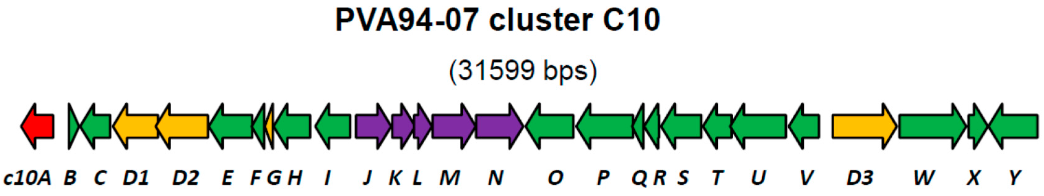 Features of the C10 cryptic biosynthetic gene cluster in S. albus PVA94-07.