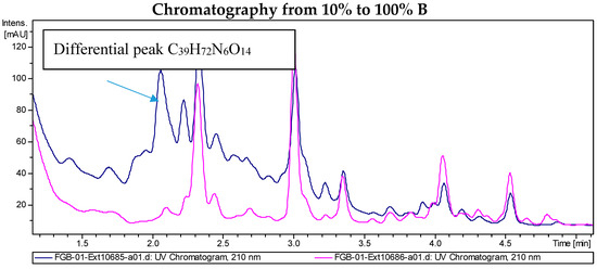 Chromatograms of the extract from S. albus PVA94-07 carrying an empty vector (pink) and S. albus PVA94-07 overexpressing the c10A regulatory gene (blue). Differential peaks and molecular formulae for the corresponding compounds are indicated.