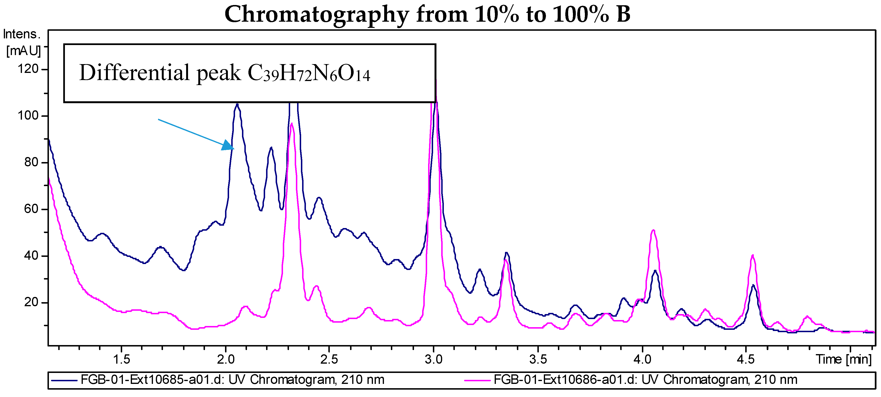 A lyophilized culture (38.0 g) of PVA94-07 overexpressing the c10A gene was extracted with CH2Cl2:CH3OH 2:1 (4 × 450 mL). The organic phase was evaporated to dryness to afford 13.0 g of dried extract that was subjected to reversed phase low pressure flash chromatography on silica gel (RP18) (70 g C18, 40–60 µm). The column (h = 10 cm, Ø = 3.2 cm) was conditioned with 5% of CH3CN in water for 5 min and eluted at 18 mL/min using a linear gradient from 5%–100% of CH3CN in water for 35 min with a final washing step of 20 min at 100% CH3CN. A total of 50 fractions of 18 mL were collected. Differential peaks with respect to the PVA94-07 culture previously identified were located in Fractions 11 and 15 of this chromatography by LC/HRMS.