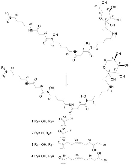 Compound 4 was isomeric with 3, and the same molecular formula was assigned after ESI-TOF analysis. Their NMR spectra clearly showed the expected similarity between both molecules. The most remarkable difference between the 1H-NMR spectra (Table S4) was the disappearance of the triplet methyl signal present in the spectrum of 3, which now appears as a methyl doublet signal at a slightly lower field. The olefinic proton signals appear at an identical chemical shift and with an identical coupling pattern. Thus, the only structural difference is a change in the placement of the secondary hydroxyl group present in the acyl moiety. This hydroxylated methine is now vicinal to the terminal methyl group, explaining its multiplicity as a doublet and also its downfield chemical shift. The comparison of the corresponding HSQC spectra confirmed this conclusion. Compound 4 had therefore a (Z)-9-hydroxydec-4-enyl group replacing the acetyl group present in Compound 1. NMR spectra of Compounds 1–4 are given in the Supplemental Materials (Figures S1–S16).
