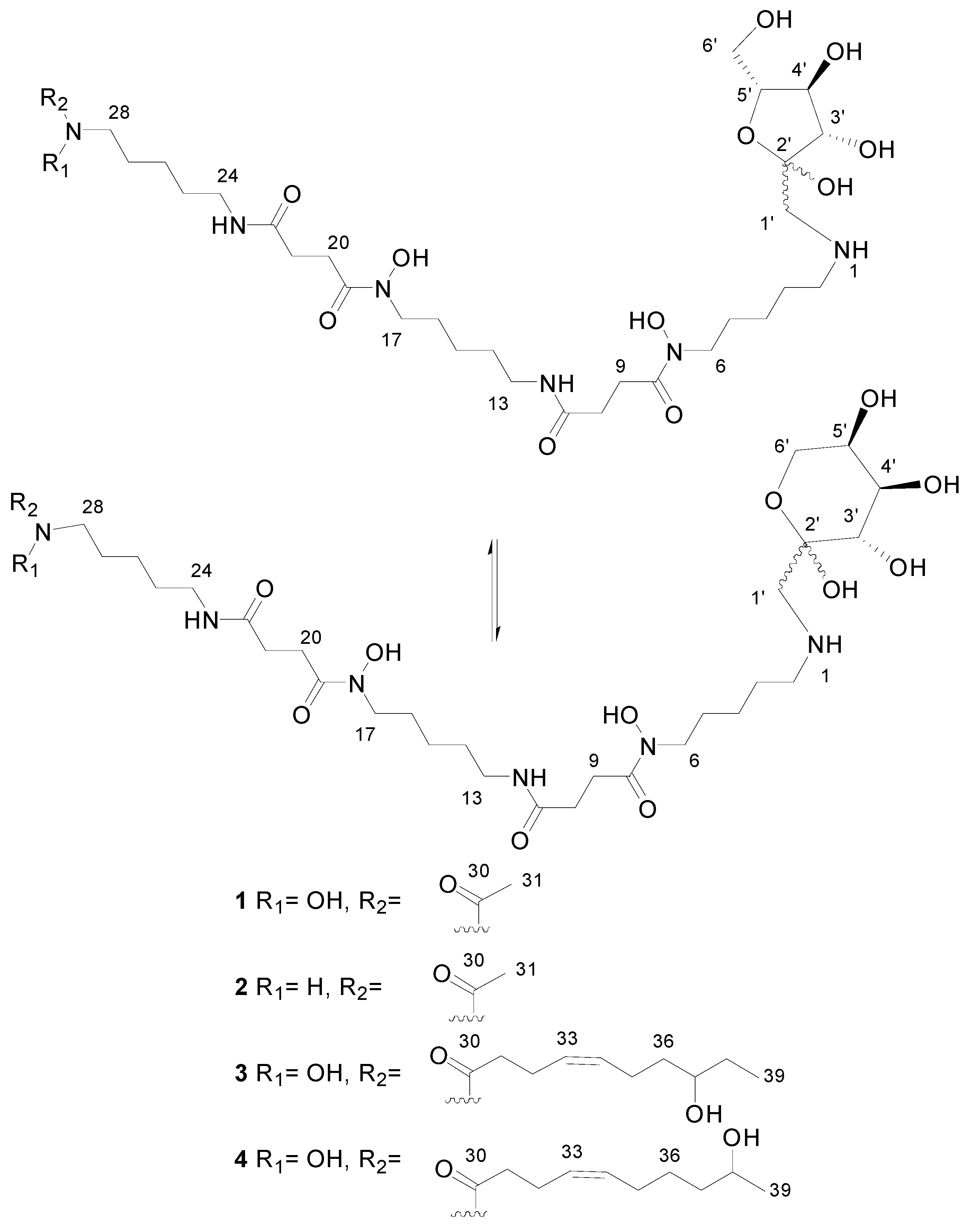 Fraction 11 (18.1 mg) was dissolved in 200 µL of 50% MeOH and further fractionated by reversed phase semi-preparative HPLC (Agilent ZORBAX SB-C8, 9.4 × 250 mm, 5 µm; 3.6 mL/min, UV detection at 210 nm and 280 nm) with a linear gradient of CH3CN in water from 5%–50% over 35 min where fractions containing Compound 1 (1 mg) eluted between 20.5 and 25.5 min and fractions containing Compound 2 (2 mg) eluted at 27 min. Combined dried fractions containing Compound 1 were dissolved in 50 µL of MeOH and further fractionated by reversed phase semi-preparative HPLC (XBridge C18, 10 × 150 mm, 5 µm; 3.6 mL/min, UV detection at 210 nm and 280 nm) with a linear gradient of CH3CN in water from 5%–40% over 35 min where Compound 1 (0.1 mg) eluted between 12 and 15 min. Fractions containing Compound 2 were dissolved in 70 µL of MeOH and further fractionated by reversed phase semi-preparative HPLC (Agilent ZORBAX SB-C8, 9.4 × 250 mm, 5 µm; 3.6 mL/min, UV detection at 210 nm and 280 nm) with a linear gradient of CH3CN in water from 15%–65% over 35 min, where Compound 2 (0.1 mg) eluted at 4 min. Fraction 15 (68.7 mg) was dissolved in 500 µL of MeOH and further fractionated by reversed phase semi-preparative HPLC (XBridge C18, 10 × 150 mm, 5 µm; 3.6 mL/min, UV detection at 210 nm and 280 nm) with a linear gradient of CH3CN in water from 5%–85% over 35 min, where fractions containing Compounds 3 and 4 (4.6 mg) eluted at 13.5 min. Deferoxamine (2.5 mg) eluted at 9.5 minutes from this chromatography. Further purification of fractions containing Compounds 3 and 4 by reversed phase semi-preparative HPLC (XBridge C18, 10 × 150 mm, 5 µm; 3.6 mL/min, UV detection at 210 nm and 280 nm) with a linear gradient of CH3CN in water from 10%–28% over 35 min yielded two isomeric components with the molecular formula C39H72N6O14 eluting at 27.5 min, Compound 3 (0.3 mg), and 29.0 min, Compound 4 (0.7 mg).