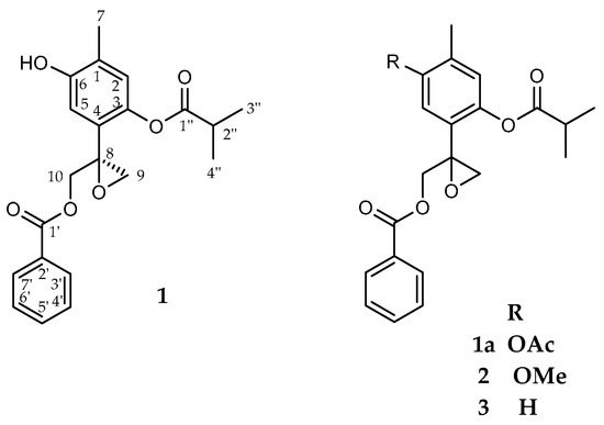 The relative position of the ester groups was established via correlations observed in the HMBC and NOESY experiments, indicating that the benzoate was attached at C-10 and isobutyrate at C-3. Accordingly the C-10 methylene protons at δ 4.77 and 4.48 showed a 3J correlation peak with the carbonyl carbon at δ 166.3, which in turn showed correlation peaks with the aromatic protons signal at δ 7.97 (H-3’/7’) in the HMBC spectrum. On the other hand the NOESY experiment showed interactions between the isobutyrate methyl protons (H-3”, H-4”) and the methylene protons at C-9, and C-10, while the aromatic proton H-2 showed couplings with H-3”, H-4”, and the methyl protons at C-7. Therefore the isobutyrate group must be attached at C-3. Further HMBC long range couplings of the C-10 methylene protons with the quaternary carbon at δ 57.3 (C-8) and the methylene carbon at δ 51.3 (C-9), suggested the presence of the oxirane group at C-8–C-9. Acetylation of 1 with pyridine and acetic anhydride led to the acetate derivative 1a (Figure 1). The 1H and 13C-NMR spectra (Table 1) of 1a displayed features similar to those of 1, except for the presence of a sharp methyl singlet at δ 2.31 in the 1H-NMR spectrum, and two extra carbon resonances (δ 168.9 and 20.8) in the 13C-NMR spectrum, associated with the presence of the acetate group. Based on all above data, the structure of compound 1, was established as 10-benzoyloxy-8,9-epoxy-6-hydroxythymol isobutyrate.